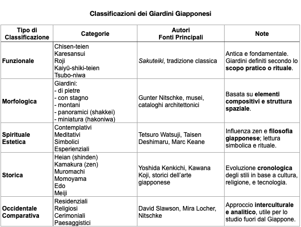Non c’è una sola classificazione, ma almeno 5 principali modalità di catalogare i giardini giapponesi, a seconda dell’approccio (funzionale, morfologico, spirituale o estetico, storico, filosofico o paesaggistico, ecc…). Ogni scuola o autore tende a combinare più criteri ma tutti condividono