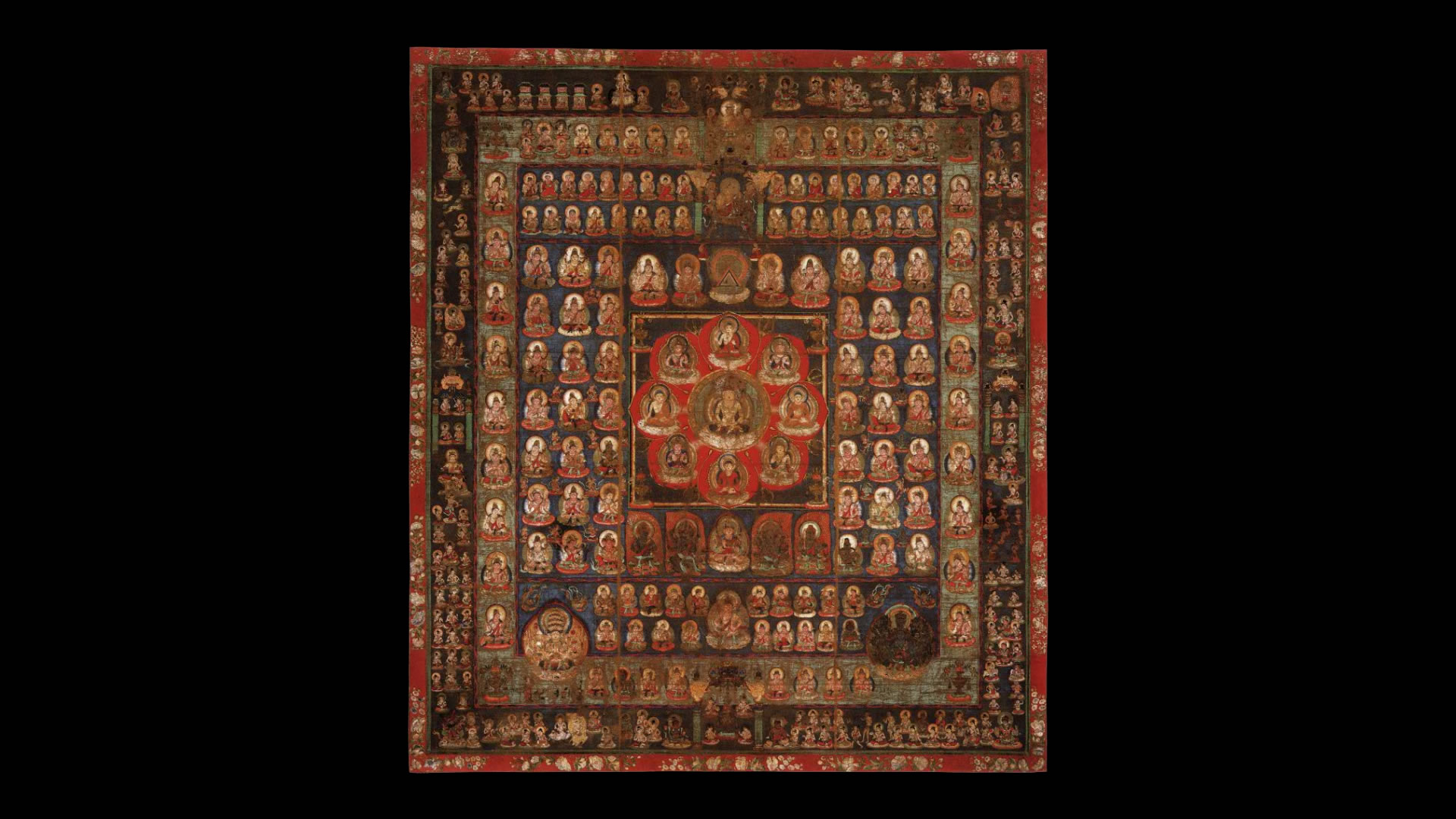 — Al centro siede Dainichi Nyorai (大日如来), il Buddha cosmico o Buddha della Grande Luce Solare.