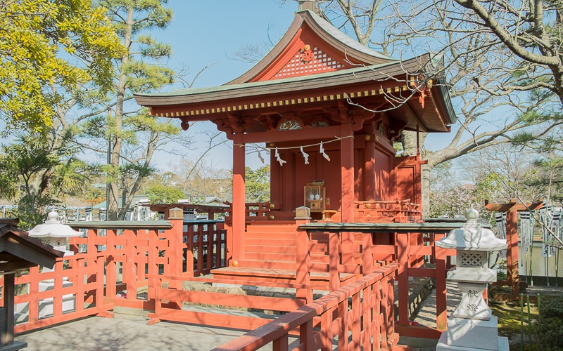 Il lago Genpei sulla destra appena suterato il torī vuole rappresentare, con i suoi ponti la rivalità fra i clan Minamoto e Taira.
