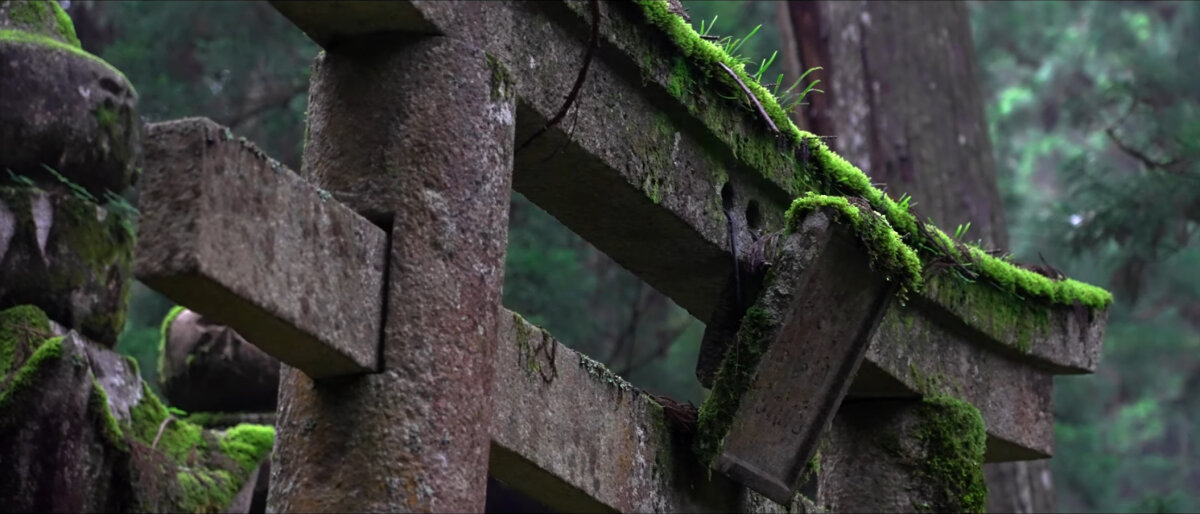 Le pietre sono coperte di licheni, le statue di Jizō7 (地蔵) indossano bavaglini rossi offerti dai pellegrini, gli alberi crescono intrecciandosi alle lanterne. Non esiste una gerarchia visiva: il sacro si distribuisce uniformemente, come una rete sottile.