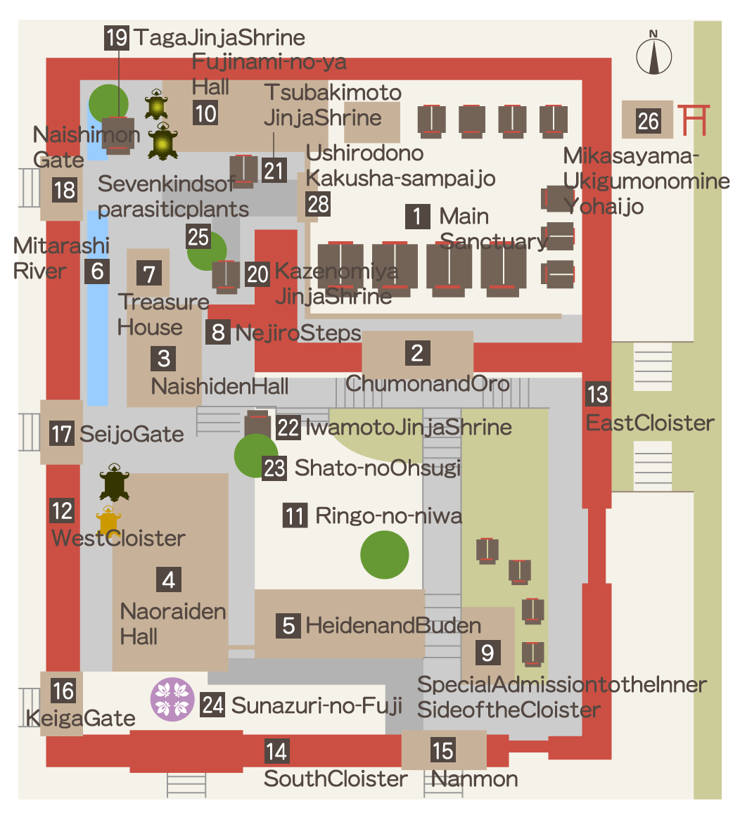 Migliaia di Lanterne: Il complesso ospita oltre 3.000 lanterne di pietra e di bronzo, donate nei secoli da fedeli e nobili.